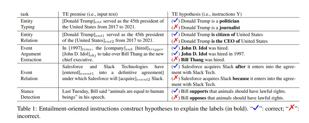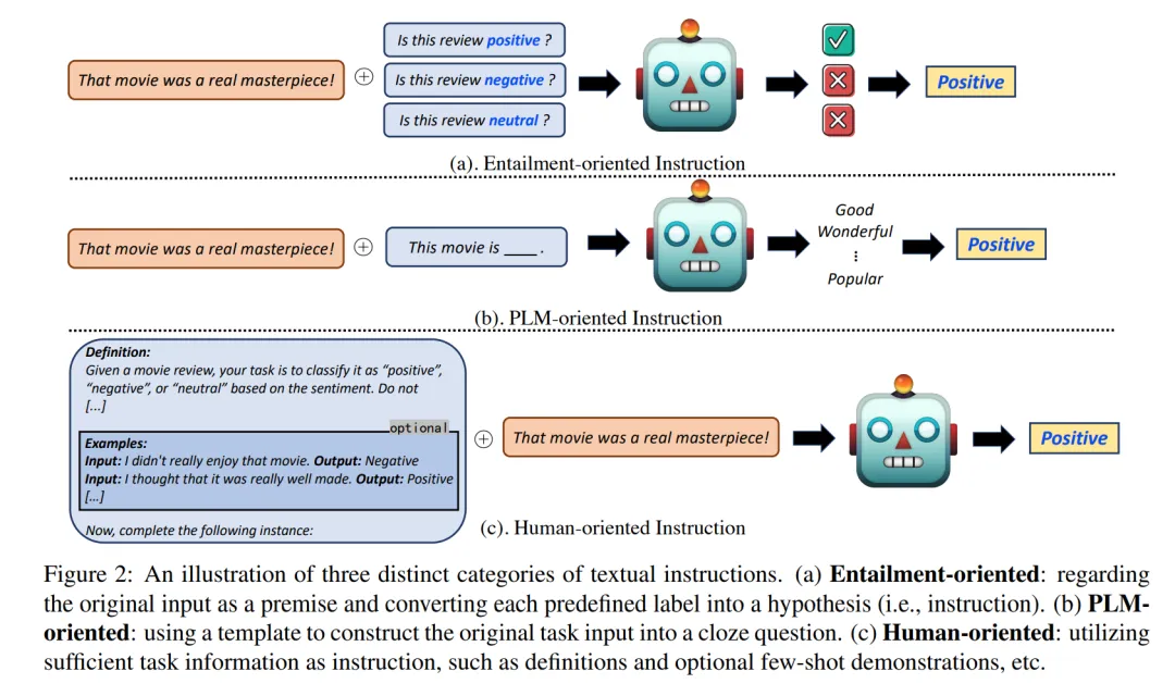 在之前的零样本和少样本NLP任务中已经使用了各种类型的文本指令,例如提示,Amazon Mechanical Turk 指令,辅以演示的指令和思维链解释。不同的指令最初是为不同的目标设计的(例如,Mturk指令最初是为人类标注者理解而创建的,提示是为了控制PLM)。在本节中,如图2所示,我们首先将这些指令总结为三个类别,它们执行T、X和ˆY的不同组合(面向蕴含、面向PLM和面向人),然后比较它们并提供指令的正式定义。3.1 I=T^+Y:Entailment主导的指令处理分类任务的一个传统方案是将目标标签转换为索引,并让模型决定输入属于哪个索引。这种范式侧重于对输入语义进行编码,同时丢失标签语义。为了让系统识别新标签而不依赖于大量标记的示例,Yin等人提出为每个标签建立一个假设——然后,推导标签的真值被转换为确定假设的真值。如表1所示,这种方法内置在指令I中,将模板T与标签Y相结合,以解释每个目标标签Y。由于这种范式自然地满足文本蕴含的格式(TE,其中任务输入和指令可以分别被视为前提和假设),这些类型的指令被称为「面向蕴含(Entailment)的指令」。