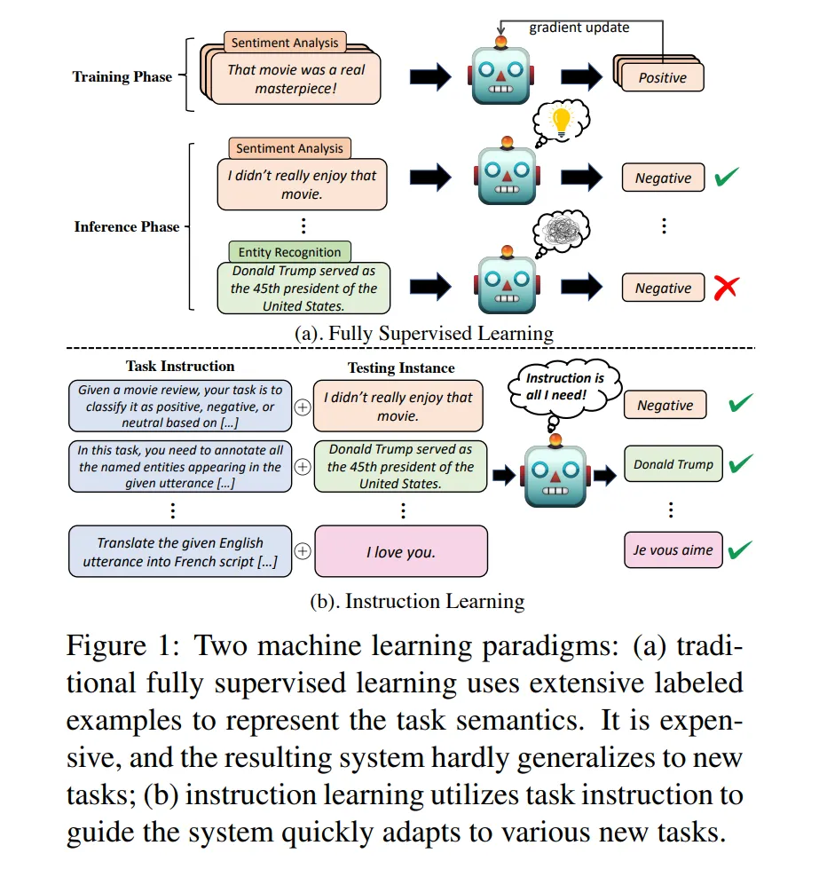 任务语义可以用一组输入到输出的例子或一条文本指令来表示。传统的自然语言处理(NLP)机器学习方法主要依赖于大规模特定任务样本集的可用性。但这出现了两个问题:首先,收集特定于任务的标记示例,不适用于任务可能太复杂或太昂贵而无法注释,或系统需要立即处理新任务的场景;其次,这对用户来说并不友好,因为最终用户可能更愿意在使用系统之前提供任务描述,而不是一组示例。因此,社区对NLP的一种新的监督寻求范式付出了越来越大的兴趣:从任务指令中学习。尽管取得了令人印象深刻的进展,但社区仍面临一些共同的问题。