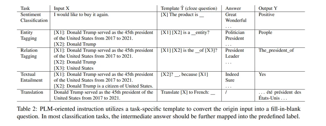 (4)将原始的闭集标签分类问题扩展为具有少量甚至零类属类样本的开放域开放形式标签识别问题。因此,它被广泛应用于各种少样本/零样本分类任务中,如分类主题、情感、姿态、实体类型和实体关系。3.2 I=T^+X:面向PLM的指令(如ˆ提示)提示是面向PLM的指令的代表,它通常是一个简短的语句,前面加上任务输入(前缀提示),或者一个完形填空问题模板(完形填空提示)。它主要用于从预训练的语言模型(PLM)中查询中间响应(可以进一步转换为最终答案)。由于提示输入符合PLM的预训练目标,例如,完形风格的输入满足掩码语言建模目标,它有助于摆脱对传统监督微调的依赖,并大大减轻人工标注的成本。因此,快速学习在大量之前的少量/零样本NLP任务上取得了令人印象深刻的结果,例如问答、机器翻译、情感分析、文本蕴含和命名实体识别。3.3 以人为本指示以人为本的指令基本上是指在人类注释平台上用于众包的指令(例如Amazon MTurk指令)。与面向人的指令不同,面向人的指令通常是一些人可读的、描述性的、段落式的任务特定文本信息,由任务标题、类别、定义、要避免的事项等组成。因此,以人为本的指令更加友好,可以理想地应用于几乎任何复杂的NLP任务。