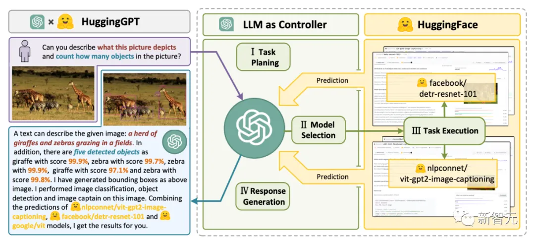 为了处理复杂的人工智能任务,LLMs应该能够与外部模型协调,以利用它们的能力。因此,关键点在于如何选择合适的中间件来桥接LLMs和AI模型。研究者发现,每个AI模型都可以通过总结其模型功能表示为一种语言形式。由此,便引入了一个概念,「语言是LLMs,即ChatGPT,连接人工智能模型的通用接口」。通过将AI模型描述纳入提示中,ChatGPT可以被视为管理人工智能模型的大脑。因此,这一方法可以让ChatGPT能够调用外部模型,来解决实际任务。简单来讲,HuggingGPT是一个协作系统,并非是大模型。它的作用就是连接ChatGPT和HuggingFace,进而处理不同模态的输入,并解决众多复杂的人工智能任务。所以,HuggingFace社区中的每个AI模型,在HuggingGPT库中都有相应的模型描述,并将其融合到提示中以建立与ChatGPT的连接。随后,HuggingGPT将ChatGPT作为大脑来确定问题的答案。到目前为止,HuggingGPT已经围绕ChatGPT在HuggingFace上集成了数百个模型,涵盖了文本分类、目标检测、语义分割、图像生成、问答、文本到语音、文本到视频等24个任务。实验结果证明,HuggingGPT拥有处理多模态信息和复杂人工智能任务的能力。四步工作流程HuggingGPT整个工作流程可以分为如下四个阶段:- 任务规划:ChatGPT解析用户请求,将其分解为多个任务,并根据其知识规划任务顺序和依赖关系- 模型选择:LLM根据HuggingFace中的模型描述将解析后的任务分配给专家模型- 任务执行:专家模型在推理端点上执行分配的任务,并将执行信息和推理结果记录到LLM中- 响应生成:LLM总结执行过程日志和推理结果,并将摘要返回给用户
