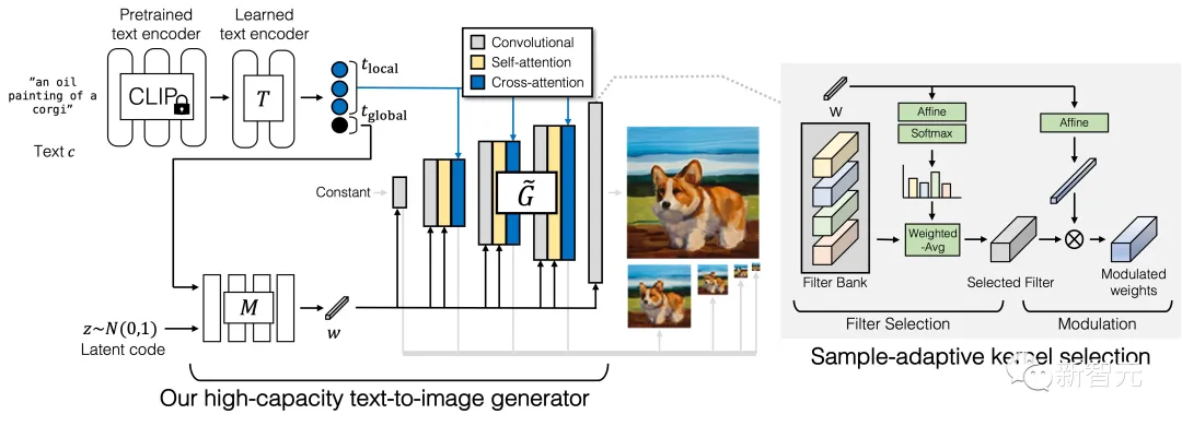 合成网络采用样式编码作为modulation,以文本嵌入作为注意力来生成image pyramid,在此基础上,引入样本自适应核选择算法,实现了基于输入文本条件的卷积核自适应选择。