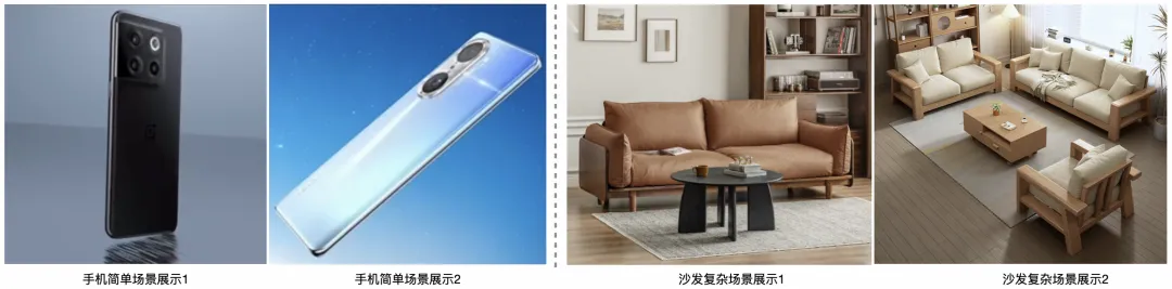 对于不同品类的商品,所需场景复杂度是完全不一样的。以手机和沙发为例,一般展示手机的3D场景以抽象的风格为主,比如星空、天空、或者一些抽象艺术风类似于手机内置的壁纸其主要目的是配合手机的外观以及屏幕壁纸颜色进行展示,整体场景相对简单,而展示沙发一般以实景场景为主并且需要在一个非常好看的客厅空间进展展示,为了营造温馨或者奢华的视觉效果还需额外大量的辅搭物品,如下图所示: