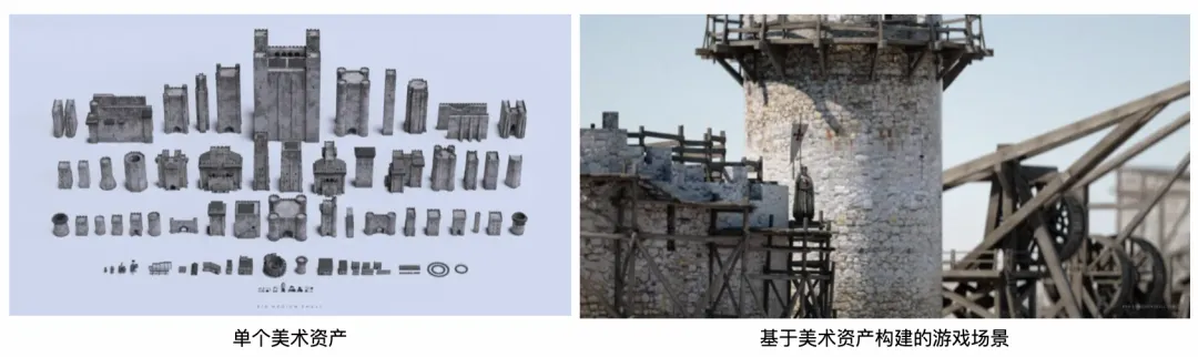 在进行游戏创作时最缺的是美术资产,比如要搭建一个中世界风的游戏,前期需要创作大量的美术资产,如下图所示,如今游戏产业针对美术资产的创作已经形成了一个比较完善的工业化解决方案。