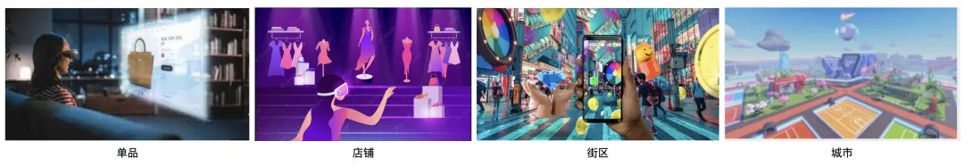 电商域的3D场景由小到大一般可以分成展示单品的3D场景、展示店铺的3D场景、商业街区场景、虚拟城市场景,如下图所示: