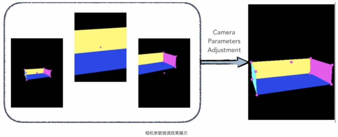 迁移到3D场景中时,由于3D场景内物体在尺寸上与商品主图不一定完全一致,为了保证主物体在画面中的占比,需要进行机位微调,如下图所示是微调的过程,微调的目标就是主物体在画面中的占比
