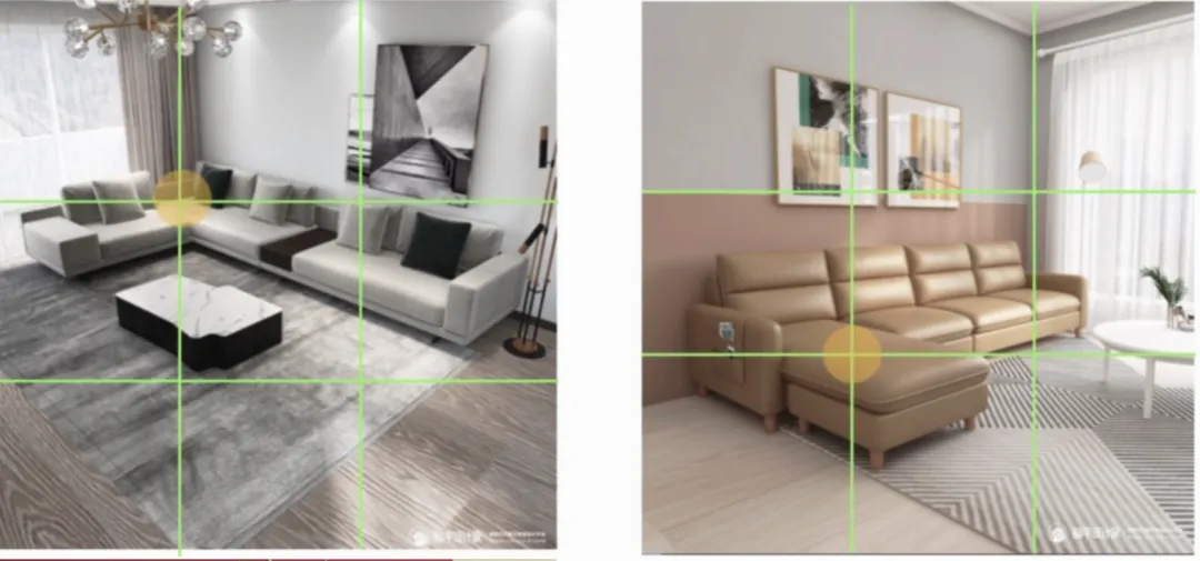 将待拍摄的画面通过两条横线和两条竖线分隔成九个象限,产出四个焦点,这四个焦点称之为黄金分割点,只要把待展示的物体放到这4个焦点的上,就能产出一幅比较不错的图片,还是以沙发为例,通过运用“井”字构图法,分别将焦点置于(2,1)和(1,2)处,就能拍摄出不错的图片,如下图所示: