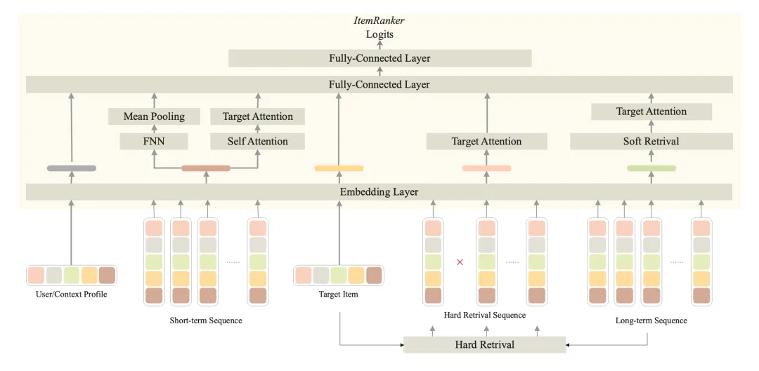 我们借鉴了SIM 和 ETA 两种模型,实现对用户长周期兴趣建模,具体模型结构如下: