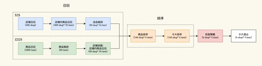 - 店品两级建模:基于店品召回引擎返回的候选卡片(一店+N品),店品排序模型采用级联的方式端到端地对商品和卡片进行两级打分,并最终实现卡片组装(一店+三品)和卡片排序。