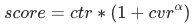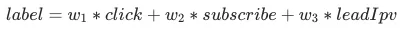- 公式法融合:参考 ctr 和 cvr 的融合公式,我们将其推广到融合点击分、订阅分和 引导ipv分:,其中表示店铺从点击到订阅的概率,表示 引导ipv分数和 ctr 的比值。经线上AB实验,最终确定一组最优参数。