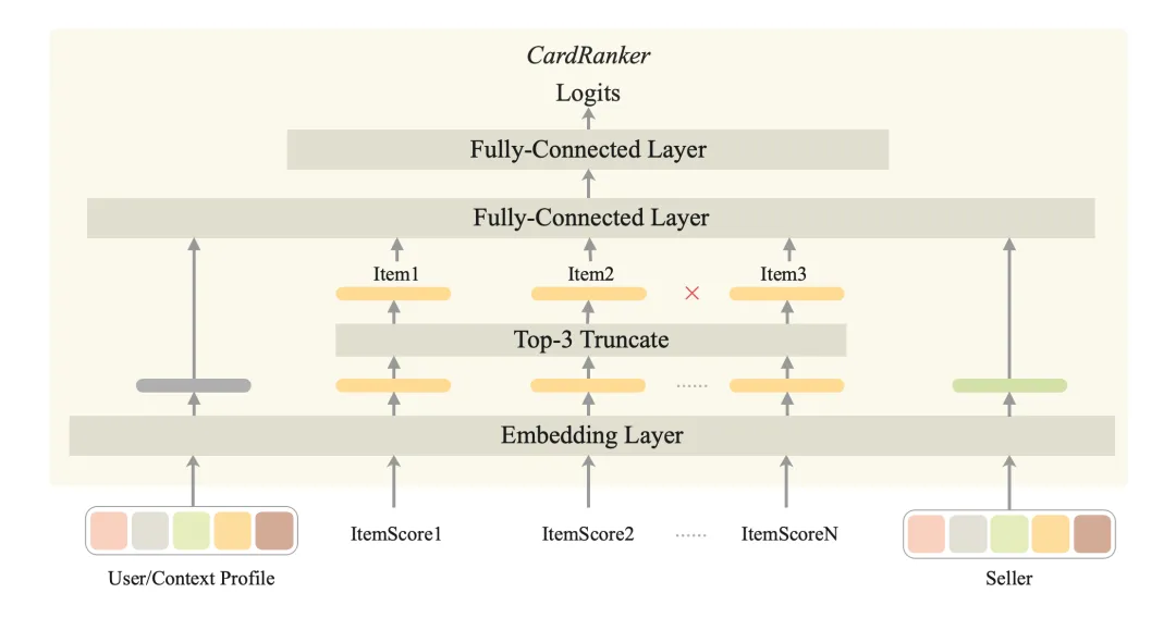 - 组装卡片:基于商品排序的分数,卡片排序模型选择 top3 用于组装卡片;