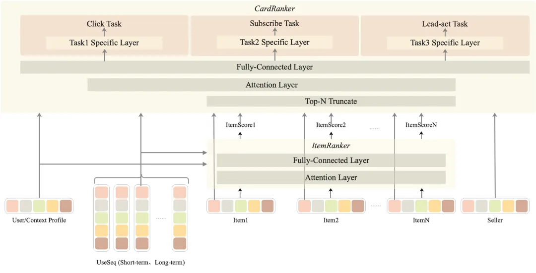 卡片排序是本场景比较独特的一环:相比于商品和店铺,卡片是一个两级结构,排序时需要同时考虑商品和店铺。我们将卡片排序建模为级联模型:商品排序和卡片排序,商品排序用于选择卡片内的商品从而组装卡片,卡片排序用于对组装好的卡片进行排序。
