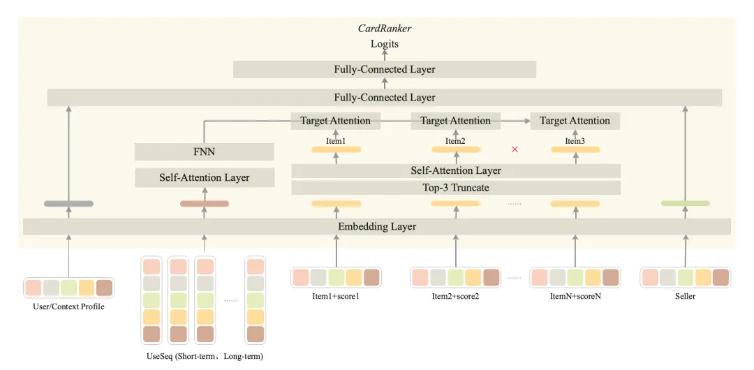 - 卡片排序:引入商品分、用户特征以及店铺特征,经过若干层全连接后,得到卡片的 ctr 分。