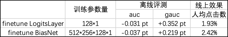 但是实践中发现,基于首猜模型直接finetune负向效果明显。分析发现首猜样本和好店商品样本差异较为明显,且本场景样本数据量较少而模型参数量较大,因此,因此在实践中只训练揽月模型的LogitsLayer和BiasNet部分,具体实验结果如下。
