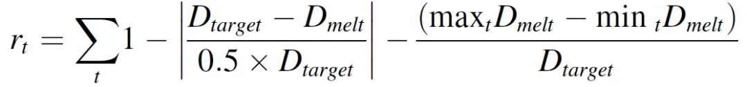 公式(2.12)和(2.13)中,v 和 P 分别表示基于规定动作的速度和功率。奖励函数量化了控制策略在一个 episode 中的性能,奖励定义为目标熔化深度和当前深度之间的绝对误差。此外,还增加了一个避免 “欺骗(cheating)” 的正则化项,该正则化项的作用是惩罚在 episode 期间观察到的最小和最大熔融深度之间的距离,从而避免可能导致熔融深度突然峰值的异常策略。