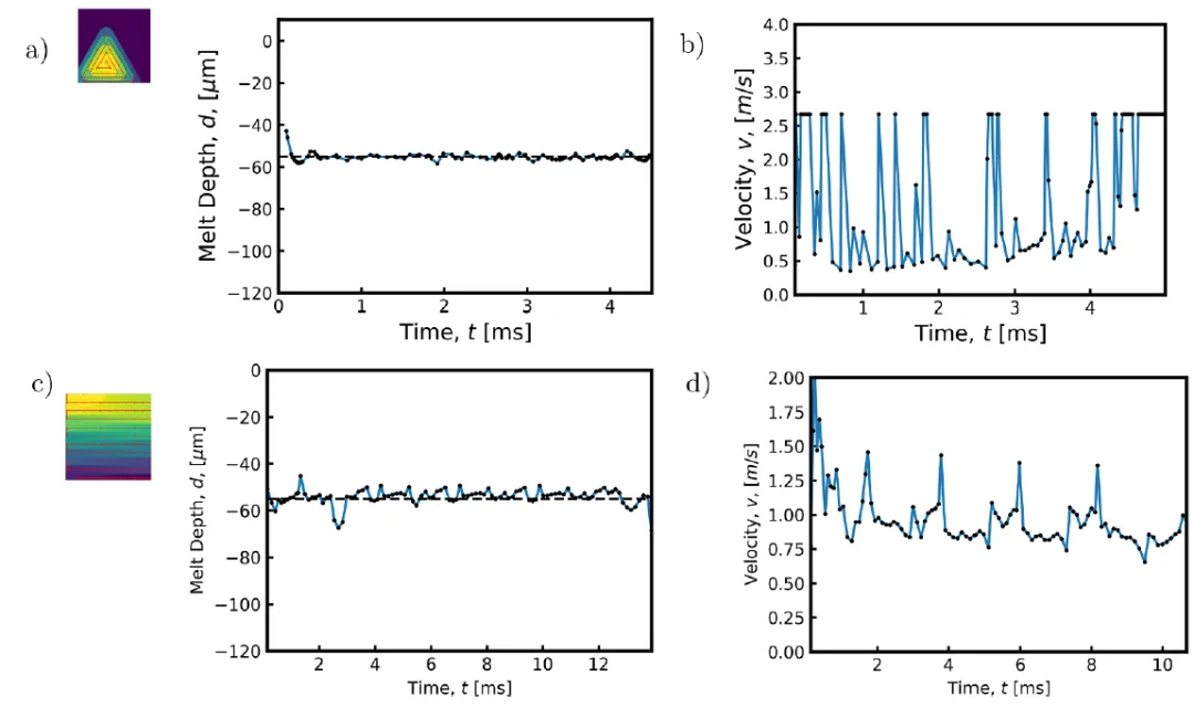 图 14. (a) 发现的水平交叉阴影扫描路径的控制策略。当激光在边界附近反转方向以减少这些区域的热能积累时,速度增加。(b) 按照导出的控制策略,同心三角形扫描路径实现的熔体深度。(c) 根据导出的控制策略,水平交叉阴影扫描路径达到的熔化深度。(d) 导出了同心三角形路径的控制策略。当激光改变方向时,速度增加,当激光接近扫描路径中心时,平均速度逐渐增加