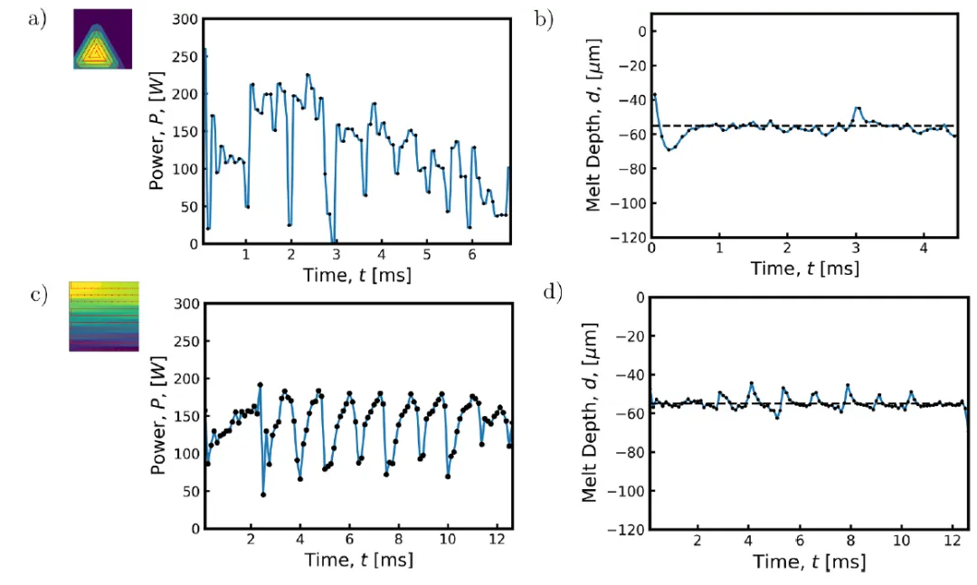 图 17. (a) 按照导出的控制策略,同心三角形扫描路径实现的熔体深度。(b) 发现的水平交叉阴影扫描路径的控制策略。当激光在边界附近反转方向以减少这些区域的热能积累时,功率降低。(c) 导出了同心三角形路径的控制策略。当激光改变方向时,功率降低,随着激光接近扫描路径中心,平均功率也逐渐降低。(d) 根据导出的控制策略,水平交叉阴影扫描路径达到的熔化深度