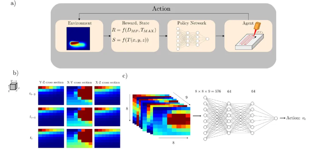 在强化学习中,策略根据环境输入确定要采取的最佳控制动作。这种动作随后会影响环境,而这种影响通过奖励来量化。具体来说,状态空间 S 定义为环境当前状态的低维表示,动作空间 A 定义为 agent 可用的潜在动作,奖励量化了在前一步骤中为实现规定目标而采取的动作的效果。一个 episode 定义为环境的初始状态和最终状态之间的时间段。在这种情况下,每个 episode 被视为激光沿整个扫描路径的一次穿越,初始状态为 t=0,终端状态出现在路径的末端。图 13(a)描述了用于实现 DRL 算法的总体工作流,图 13(b)和图 13(c)分别描述了状态和策略网络的附加上下文。