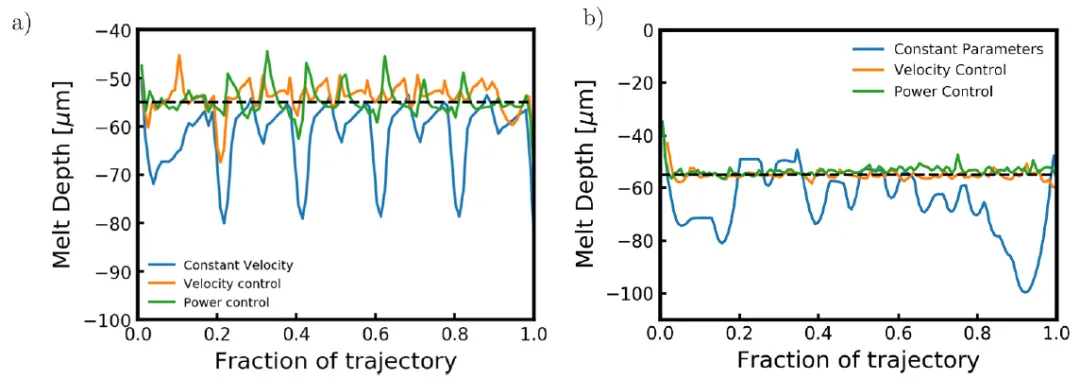 图 18.(a) 功率控制策略生成的熔深与水平交叉阴影扫描路径的恒定功率生成的熔深相比。与在整个熔化过程中施加恒定功率和速度相比,熔池深度更稳定。(b) 功率控制策略生成的熔体深度与同心三角形扫描路径的恒定功率和速度生成的熔体深度相比。与在整个熔化过程中施加恒定功率相比,熔池深度更稳定