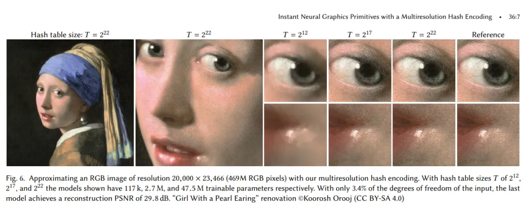 下图 6 中,英伟达使用多分辨率哈希编码近似一张分辨率为 20,000 × 23,466(469M RGB 像素)的 RGB 图像。