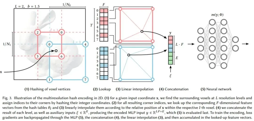 下图 3 展示了多分辨率哈希编码中的执行步骤: