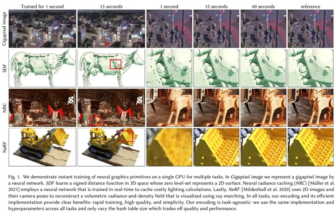 结果表明,在经过几秒钟的训练后,英伟达的多分辨率哈希编码在各类任务实现了 SOTA 效果,如下图 1 所示: