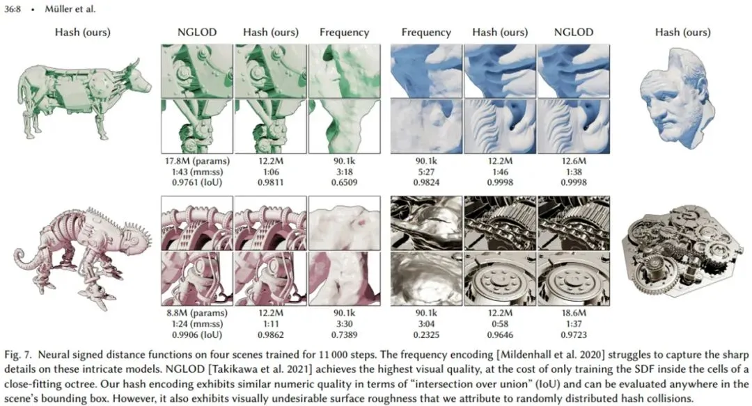 然后是神经符号距离函数(SDF)。如下动图展示了各种 SDF 数据集的实时训练进度,训练数据是使用 NVIDIA OptiX 光线追踪框架从真值网格动态生成的。