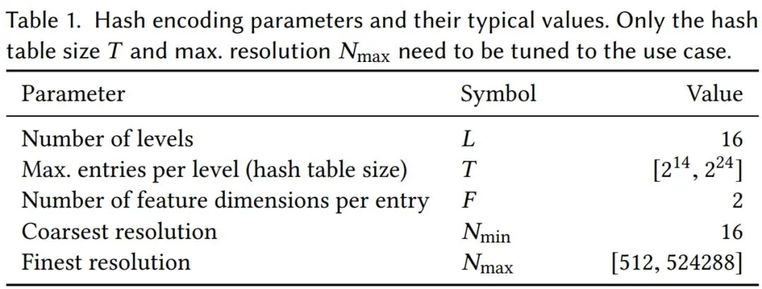 英伟达的神经网络不仅有可训练的权重参数 Φ,还有可训练的编码参数 θ。这些被排列成 L 个级别(level),每个级别包含多达 T 个 F 维 的特征向量。这些超参数的典型值如下表 1 所示:
