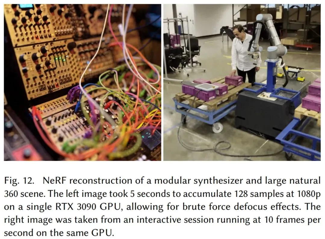 下图 12 为模块化合成器和大型自然 360 度场景的 NeRF 渲染效果。图左在使用一张 RTX 3090 的情况下,仅需 5 秒即累积了 128 个 1080p 分辨率的样本;图右使用同一张 GPU,以每秒 10 帧的速度运行交互式进程(动效图见文章开头)。