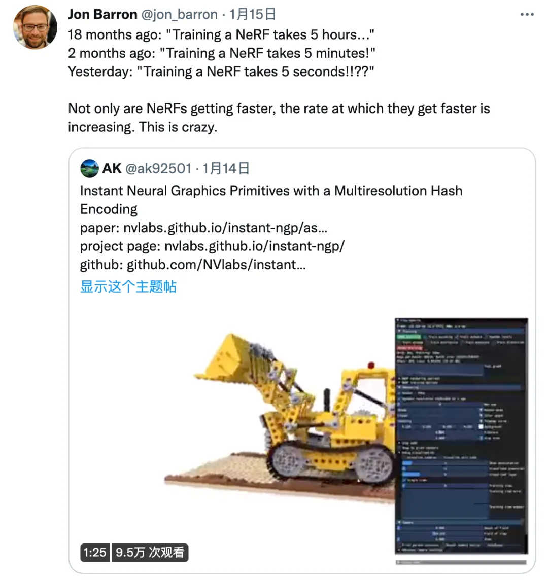 令人不可思议的是,就如谷歌科学家 Jon Barron 在推特上表示的:18 个月前,训练 NeRF 还需要 5 小时;2 个月前,训练 NeRF 最快也需要 5 分钟;就在近日,英伟达的最新技术——基于多分辨率哈希编码的即时神经图形基元,将这一过程缩减到只有 5 秒!!??