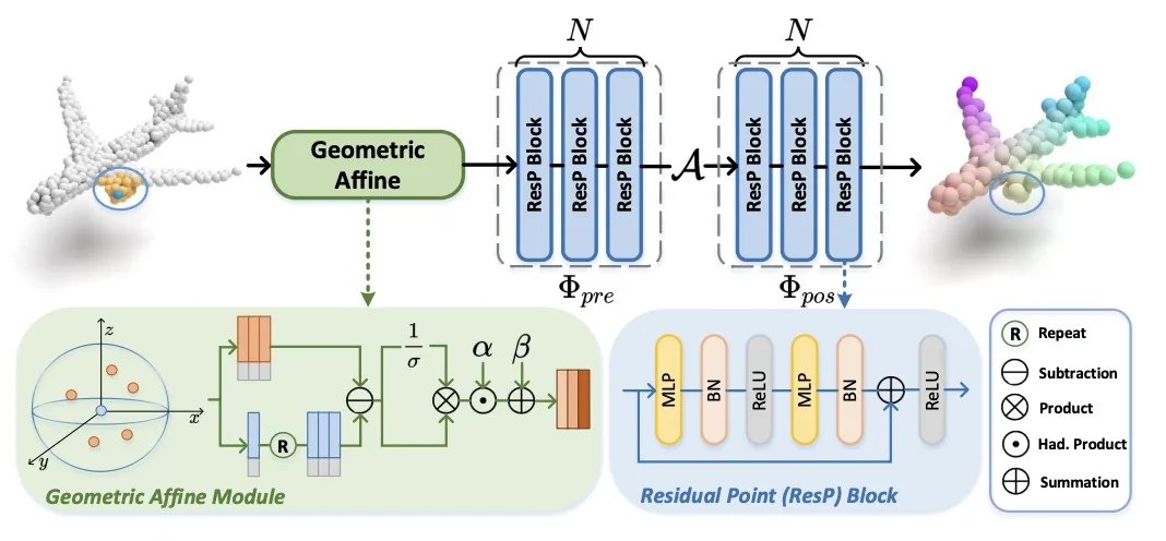给定输入点云,PointMLP 使用残差点 MLP 块逐步提取局部特征。在每个阶段,PointMLP 首先使用几何仿射模块 (Geometric Affine Module)对局部点进行仿射变换,然后通过几个残差 MLP 模块 (Residual Point Block) 来提取深层的特征。注意此时的局部区域中仍包含多个点,作者通过一个简单的聚合器 (使用的是 max-pooling) 来将局部多个点聚合成一个点以描述局部信息, 并且再次使用残差 MLP 模块来提取特征。
