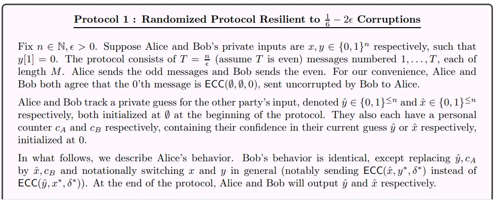 具体而言,研究者构建的协议能够在二进制位翻转信道上实现 1/6 抗误码和在二进制擦除信道上实现 1/2 抗误码,这两者的匹配上限都是已知的。他们还注意到,二进制位翻转协议的通信复杂度在输入大小上是多项式的,而二进制擦除协议的通信复杂度在最小无噪声协议计算 f 的大小上是线性的。