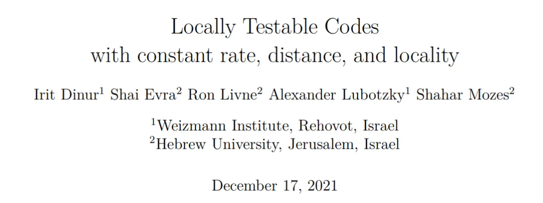 论文摘要:本地可测试代码(locally testable code, LTC)是具有属性测试器的纠错代码。测试者读取随机选择的 q 个比特,并以与它们和代码之间的距离成正比的概率拒绝单词。参数 q 为被称为测试者的位置。