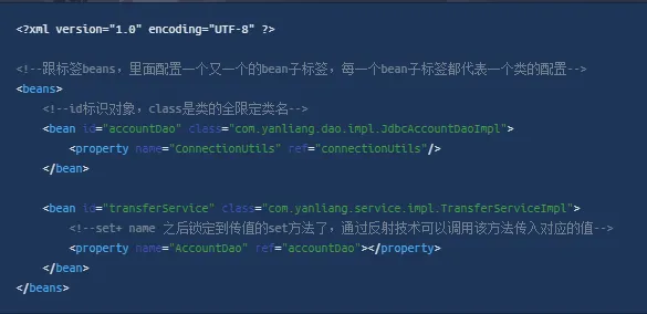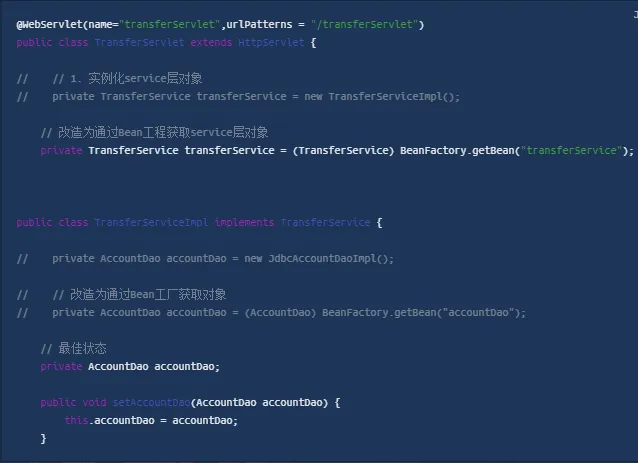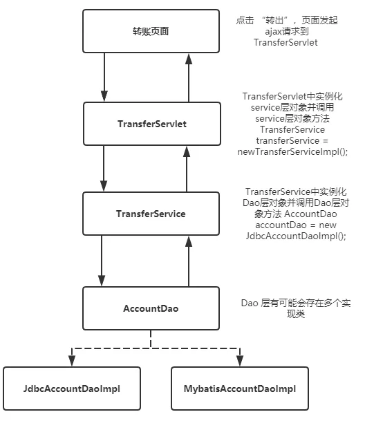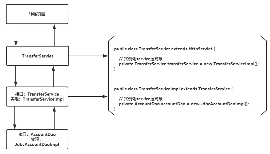 问题一: new 关键字将 service 层的实现类 TransferServiceImpl 和 Dao 层的具体实现类 JdbcAccountDaoImpl 耦合在了一起,当需要切换Dao层实现类的时候必须要修改 service 的代码、重新编译,这样不符合面向接口开发的最优原则。