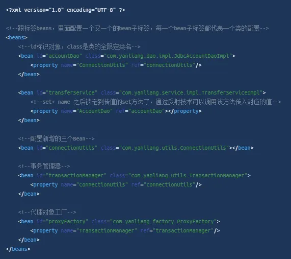 public class TransferServiceImpl implements TransferService { // 最佳状态 private AccountDao accountDao; // 构造函数传值/set方法传值 public void setAccountDao(AccountDao accountDao) { this.accountDao = accountDao; } @Override public void transfer(String fromCardNo, String toCardNo, int money) throws Exception { try{ // 开启事务(关闭事务的自动提交) TransactionManager.getInstance().beginTransaction();*/ Account from = accountDao.queryAccountByCardNo(fromCardNo); Account to = accountDao.queryAccountByCardNo(toCardNo); from.setMoney(from.getMoney()-money); to.setMoney(to.getMoney()+money); accountDao.updateAccountByCardNo(to); // 模拟异常 int c = 1/0; accountDao.updateAccountByCardNo(from); // 提交事务 TransactionManager.getInstance().commit(); }catch (Exception e) { e.printStackTrace(); // 回滚事务 TransactionManager.getInstance().rollback(); // 抛出异常便于上层servlet捕获 throw e; } } }