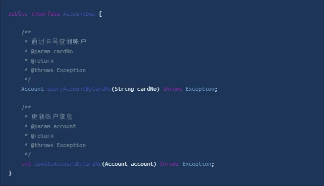 public class JdbcAccountDaoImpl implements AccountDao { @Override public Account queryAccountByCardNo(String cardNo) throws Exception { //从连接池获取连接 Connection con = DruidUtils.getInstance().getConnection(); String sql = "select * from account where cardNo=?"; PreparedStatement preparedStatement = con.prepareStatement(sql); preparedStatement.setString(1,cardNo); ResultSet resultSet = preparedStatement.executeQuery(); Account account = new Account(); while(resultSet.next()) { account.setCardNo(resultSet.getString("cardNo")); account.setName(resultSet.getString("name")); account.setMoney(resultSet.getInt("money")); } resultSet.close(); preparedStatement.close(); con.close(); return account; } @Override public int updateAccountByCardNo(Account account) throws Exception { // 从连接池获取连接 Connection con = DruidUtils.getInstance().getConnection(); String sql = "update account set money=? where cardNo=?"; PreparedStatement preparedStatement = con.prepareStatement(sql); preparedStatement.setInt(1,account.getMoney()); preparedStatement.setString(2,account.getCardNo()); int i = preparedStatement.executeUpdate(); preparedStatement.close(); con.close(); return i; } }