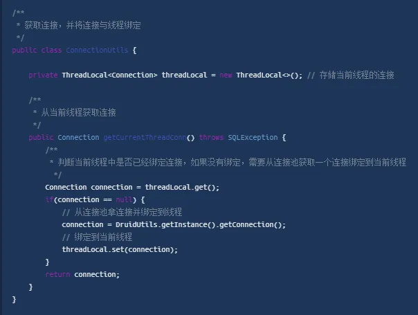 两次update属于同一个线程内的执行调用,我们可以给当前线程绑定一个Connection,和当前线程有关系的数据库操作都去使用这个connection(从当前线程中获取,第一次使用连接,发现当前线程没有,就从连接池获取一个连接绑定到当前线程)