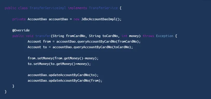 问题二: service 层没有事务控制,如果转账过程中出现异常可能会导致数据错乱,后果很严重,尤其是在金融银行领域。