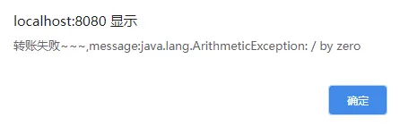 在转账的业务代码中手动模拟转账异常,来验证一下。在两个账户的转入和转出之间模拟一个分母为0的异常。