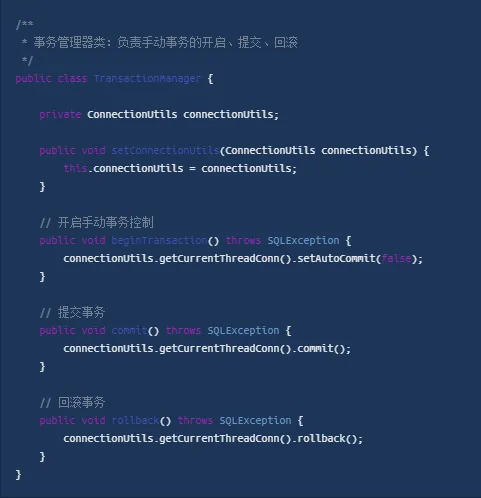 另一方面,目前事务控制是在Dao层进行的(connection),我们需要将事务控制提到service层(service层才是具体执行业务逻辑的地方,这里可能会调用多个dao层的方法,我们需要对service层的方法进行整体的事务控制)。