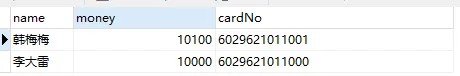 name varcher 255 用户名 money int 255 账户金额 cardNo varcher 255 银行卡号