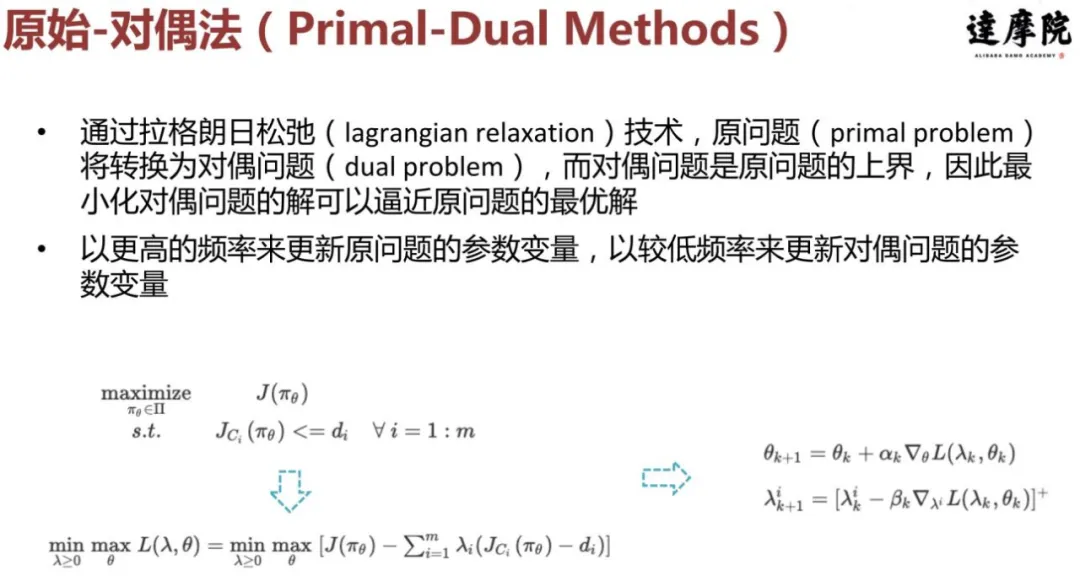 通常这一类方法是将原始优化问题的目标或约束替换为一个更易处理的代理函数。比如在 constrained policy optimization(CPO 算法)中原始问题的目标及约束被分别替换为下界及上界代理函数。当采用信赖域(Trust Region)进行策略搜索时, 可以使 worst-case 下的约束违反程度被 bound 住,而增量收益是非递减的。