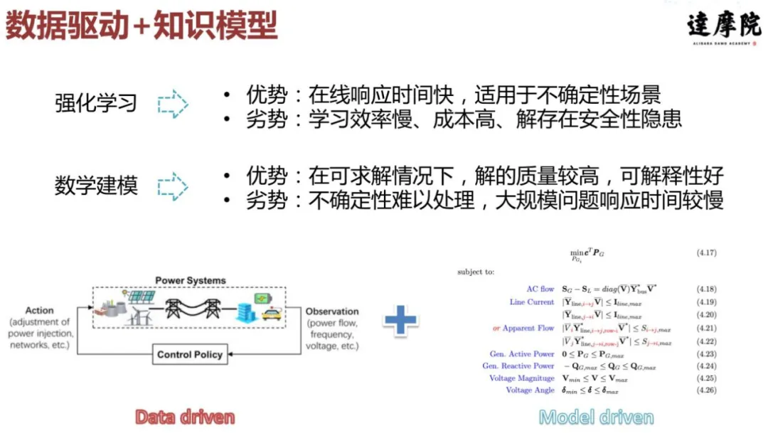 强化学习和知识模型本质上存在一些互补的优势。强化学习的优势是在线响应时间比较快,适用于不确定性场景;劣势是学习效率慢、成本高,解存在安全性隐患。而数学建模在电力领域已进行了多年研究,相对成熟。因此在可求解的情况下,解的质量会比较高,可解释性也比较好。数学建模的劣势就是对于大规模问题或不确定性问题,它的处理效果不是很好。