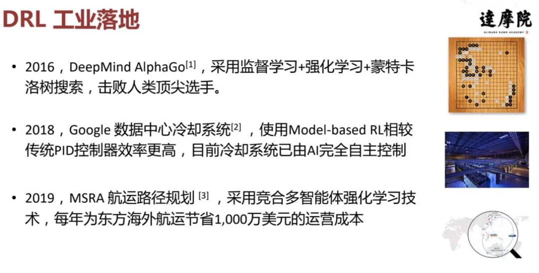 在工业落地方面,我选了两个国外的例子,一个是 Google 数据中心的冷却系统使用一种 Model-based RL 系统来控制温度,最终会比产品 PID 控制器的效率更高一些。目前谷歌宣称其冷却系统已经完全由 AI 自主控制。第二个例子是 MSRA 航运路径规划,它采用的是一种称为竞争合作的多智能体学习方法,并声称每年为其航运节省近千万美元的运营成本。
