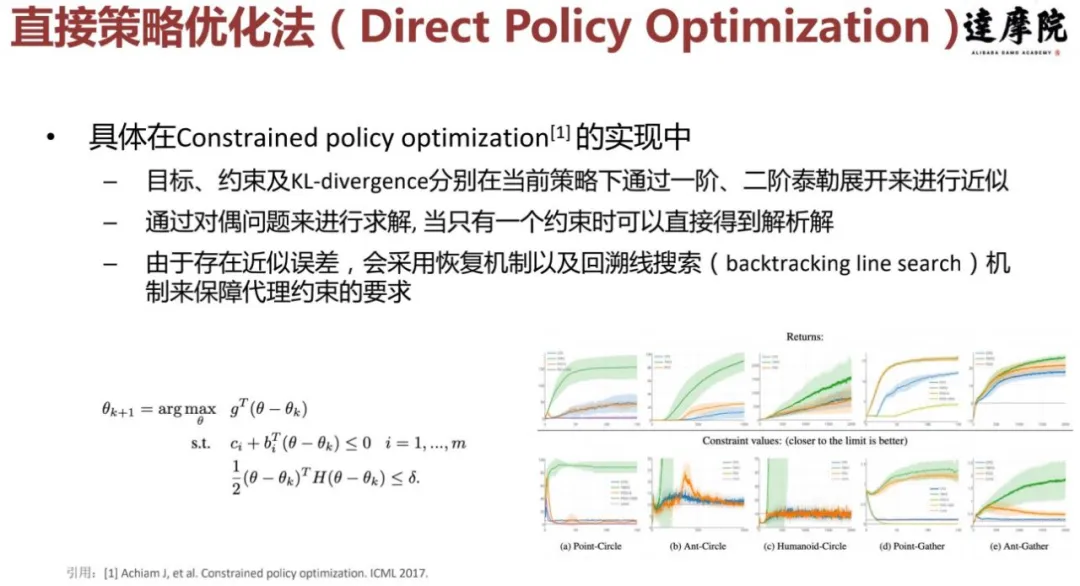 因此可以通过对偶问题来求解,尤其是假设每次只违反一个约束,对偶问题可以直接得到解析解。由于存在近似误差,会采用恢复机制以及回溯线搜索(backtracking line search)机制来保障代理约束的要求。如上图右下角所示,以 (b) 为例,我们可以看到 CPO 的蓝色曲线在最差情况下也是可以 bound 住的,但是在训练过程中不一定严格满足原来的约束。