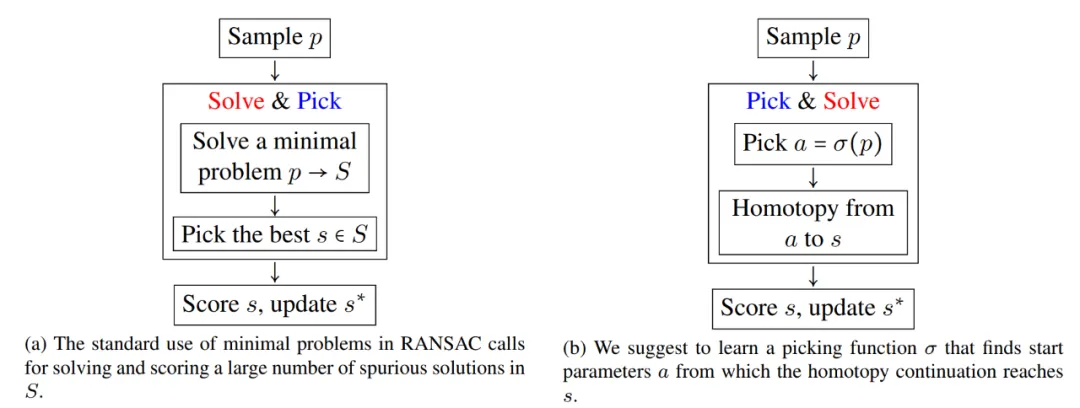 研究者设计了一种学习策略,用于选择初始问题 - 解决方案对以用数值方法继续解决原问题。该研究通过创建一个 RANSAC 求解器来演示所提方法,该求解器通过使用每个视图中的 4 个点进行最小松弛化来计算 3 个校准相机的相对位姿。平均而言,该方法可以在 70 μs、内解决一个原始问题。此外,该研究还针对校准相机的相对位姿这一问题进行了基准测试和研究。