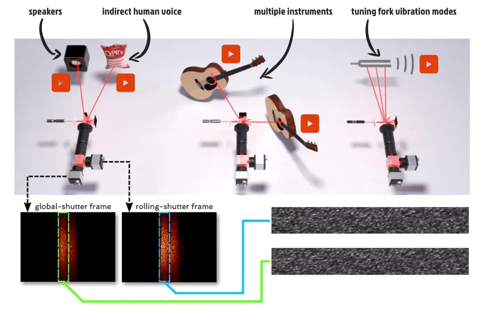 在本文中,研究者提出了一种在高速(高达 63 kHz)下同时检测多个场景源振动的新方法,该方法使用额定工作频率仅为 130Hz 的传感器。他们的方法使用两个分别配备滚动和全局快门传感器的相机来同时捕捉场景,其中滚动快门相机捕捉到对高速物体振动进行编码的失真散斑图像,全局快门相机捕捉散斑图案的未失真参考图像,从而有助于对源振动进行解码。最后,研究者通过捕捉音频源(如扬声器、人声和乐器)引起的振动并分析音叉的振动模式,展示了他们的方法。