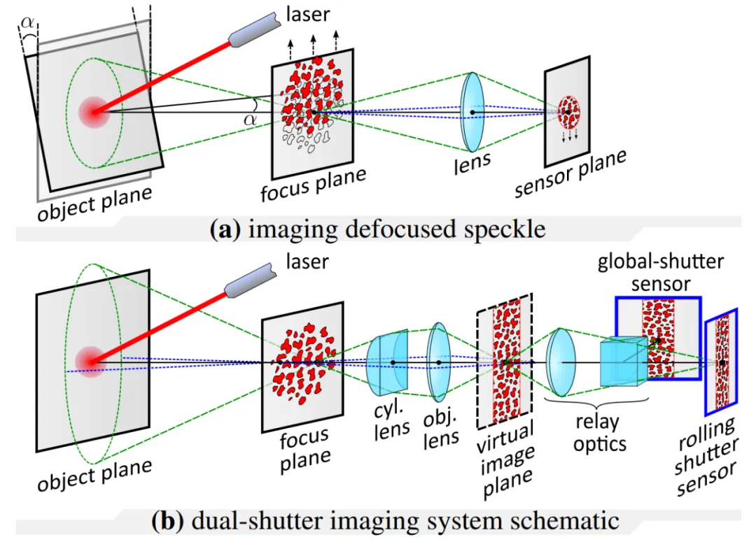 (a) 成像散焦散斑;(b) 双快门成像系统示意图。