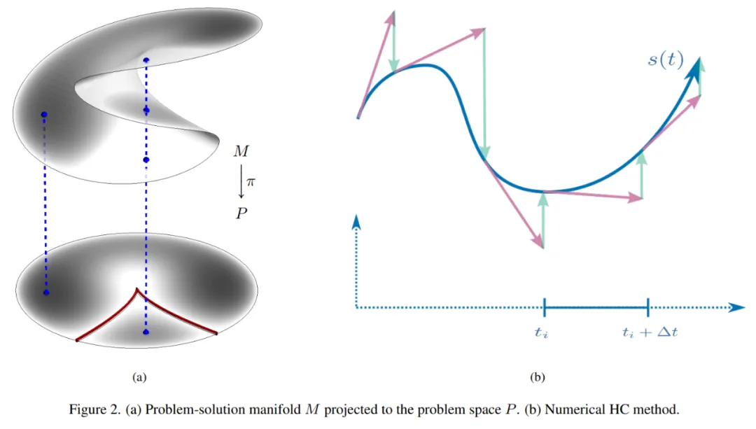 (a) 映射到问题空间 P 的问题解决流形 M;(b) 数值 HC 方法。