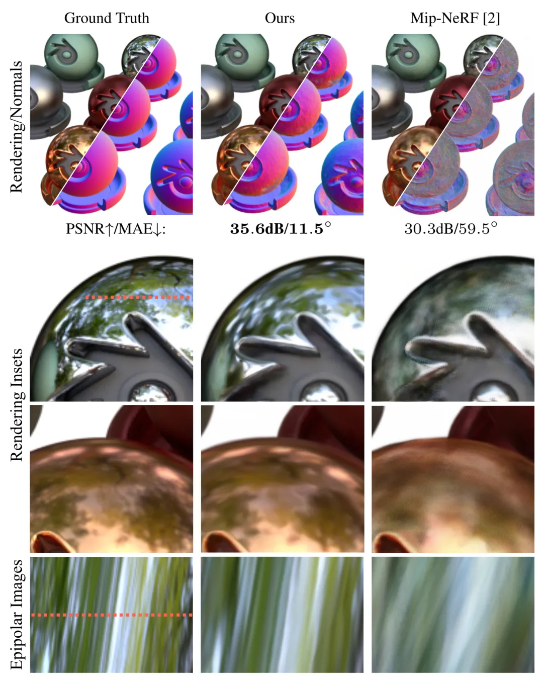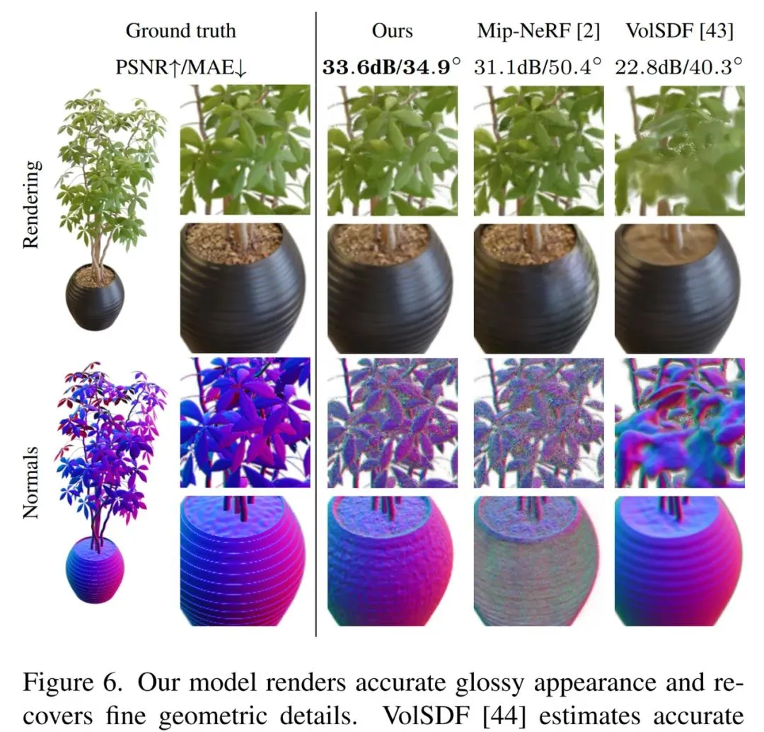 与以往表现最好的神经视图合成模型 mip-NeRF 相比,Ref-NeRF 显著提升了法向量(最上行)和视觉真实性(余下行)。