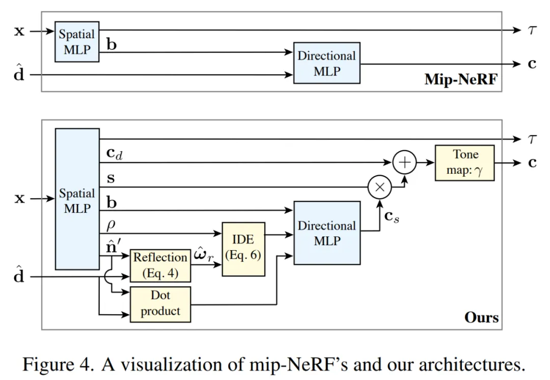 mip-NeRF(上)和 Ref-NeRF(下)的架构图比较。